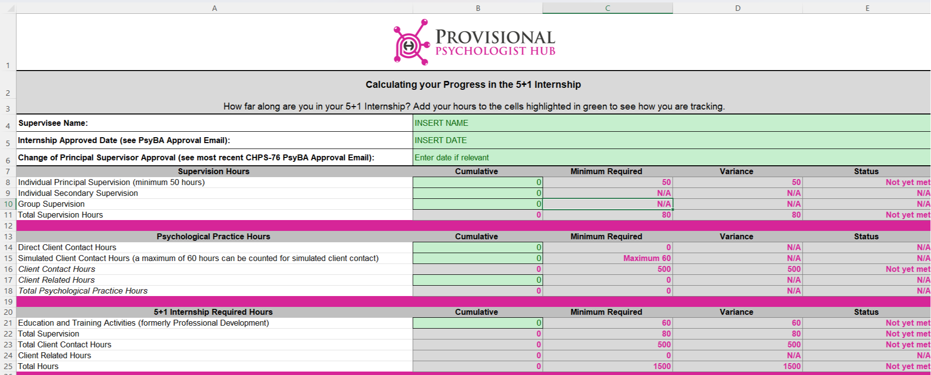 This spreadsheet has been designed and issued by the Psychology Board of Australia. Adjustments have been made by Provisional Psychologist Hub to support accurate completion, supervision ratio tracking and required hours tracking for the internship program. The original unedited version of this form is available here to download; https://www.psychologyboard.gov.au/Registration/Forms.aspx